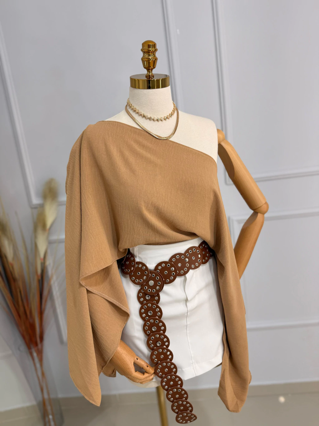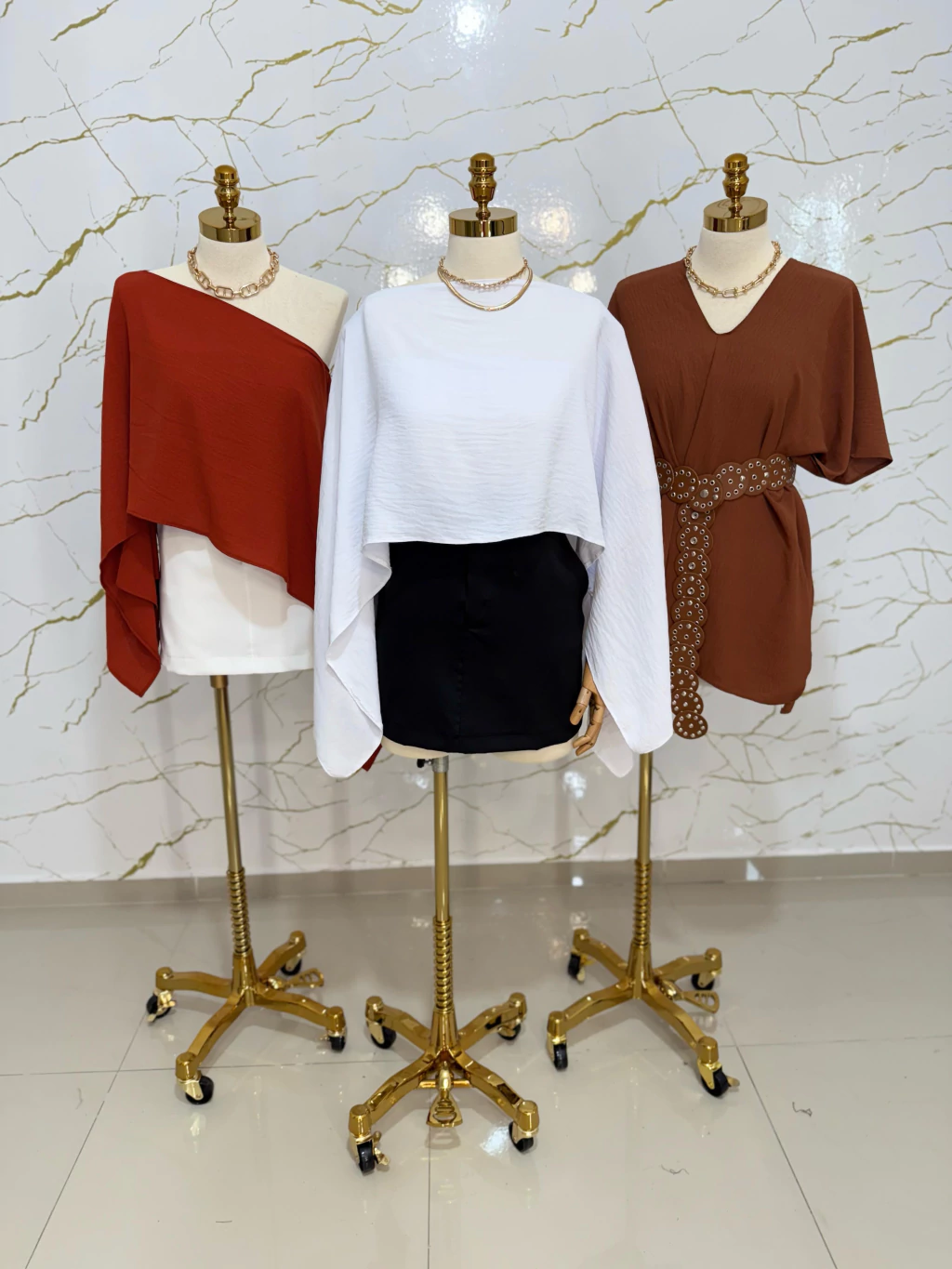 Produzida no tecido crepe duna 100% poliéster, com toque macio e com leve elastano.