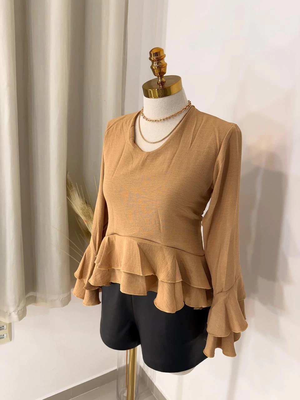 Produzida no tecido crepe duna 100% poliéster, com toque macio e com leve elastano.
