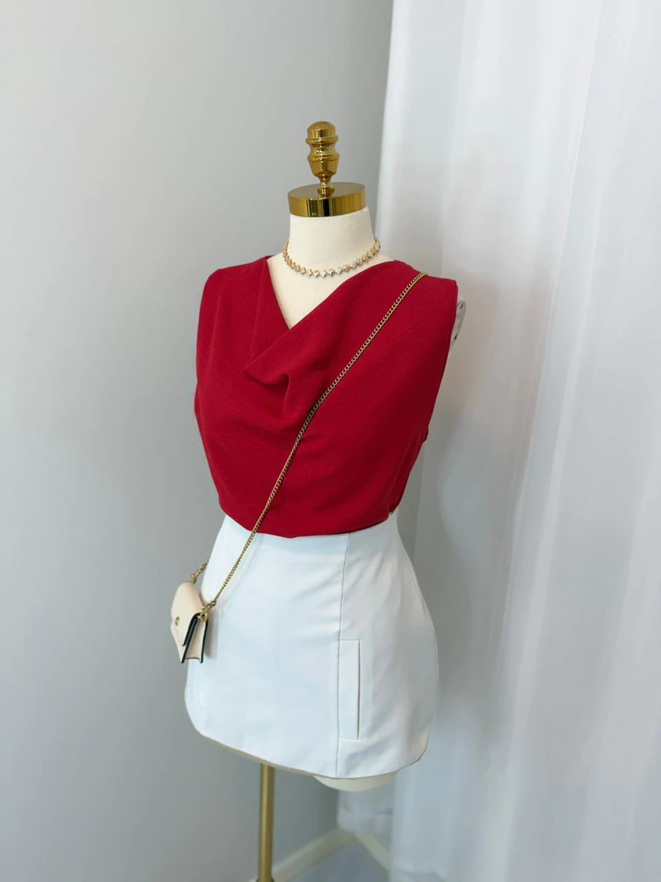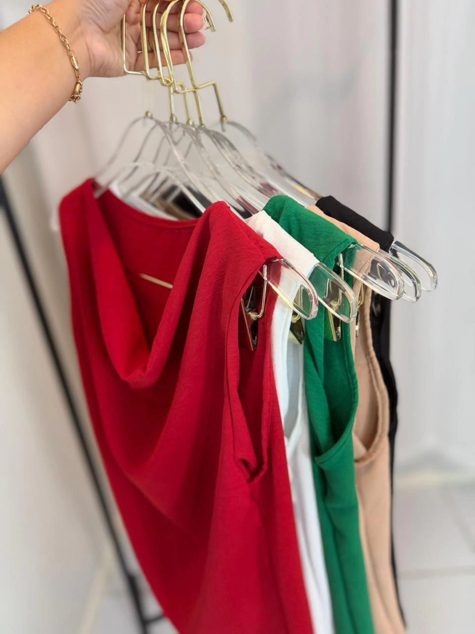 Produzida no tecido crepe duna 100% poliéster, com toque macio e com leve elastano.