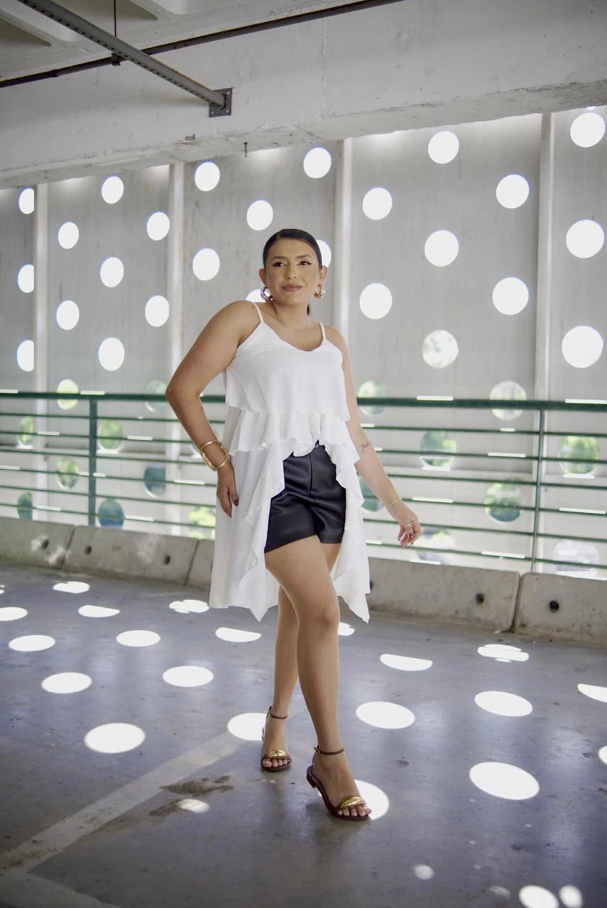 Produzida no tecido crepe duna 100% poliéster, com toque macio e com leve elastano.
