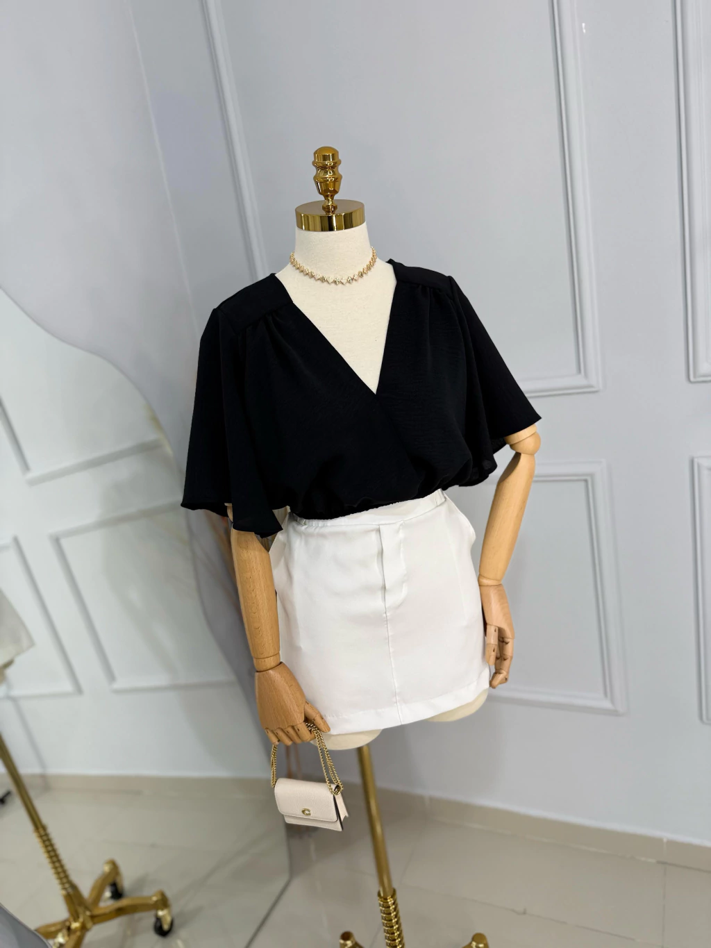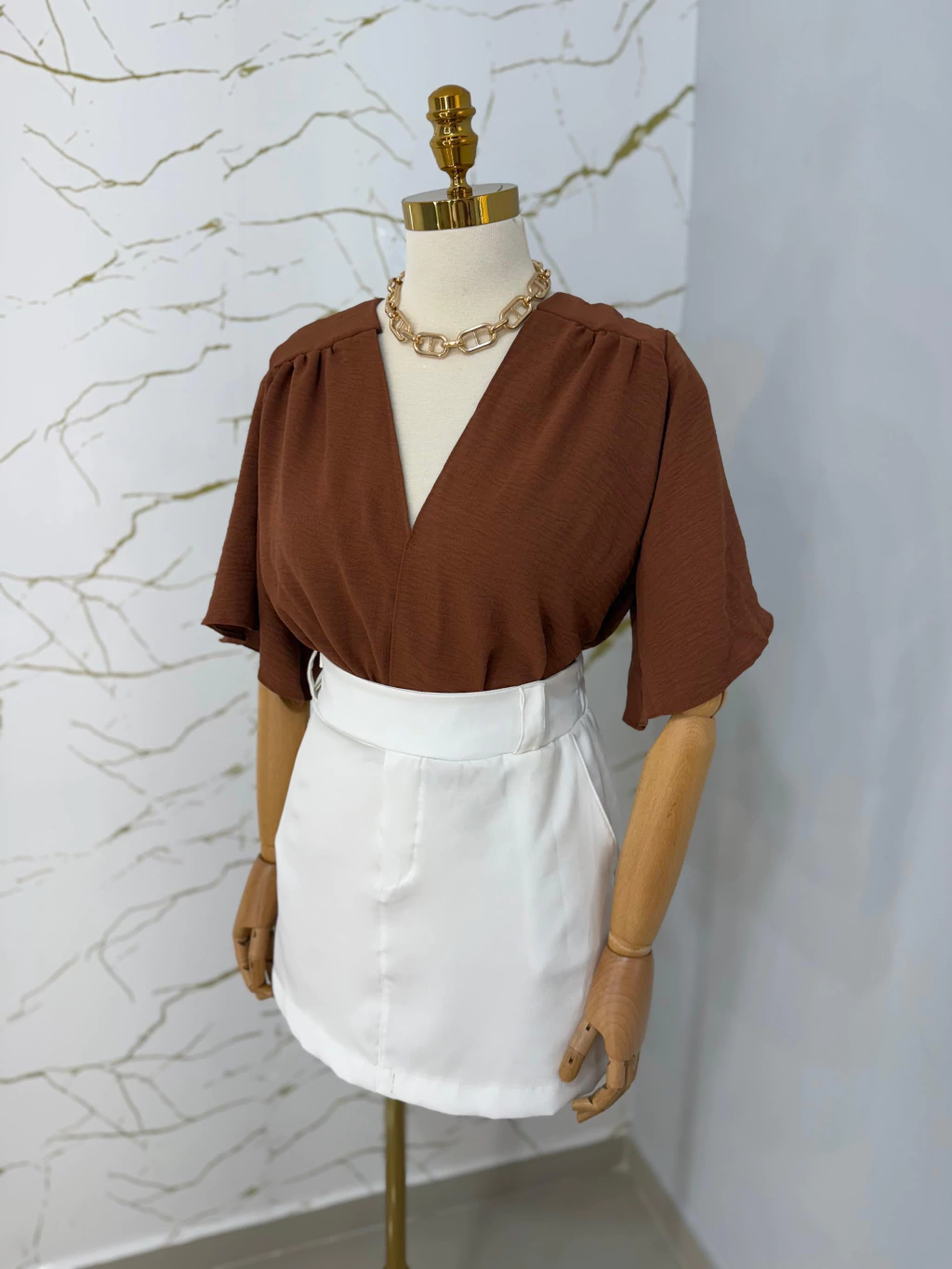 Produzida no tecido crepe duna 100% poliéster, com toque macio e com leve elastano.